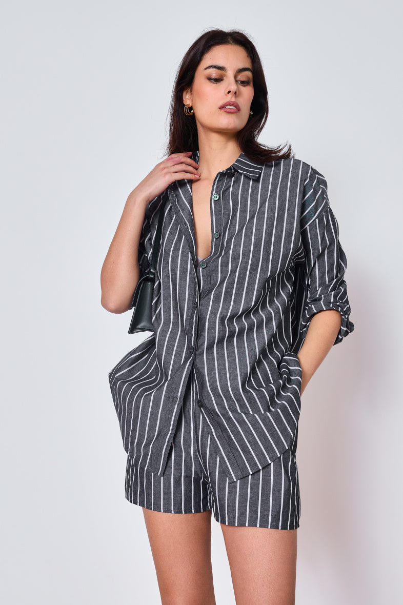 Conjunto de camisa y short con estampado de rayas verticales en blanco y negro. Ideal para un look casual con estilo. Camisa oversize. Cierre con botones en la parte delantera. base redondeada, más larga en la espalda. Pantalón corto con bolsillos laterales, elástico en la cintura. Composición:100% Algodón.