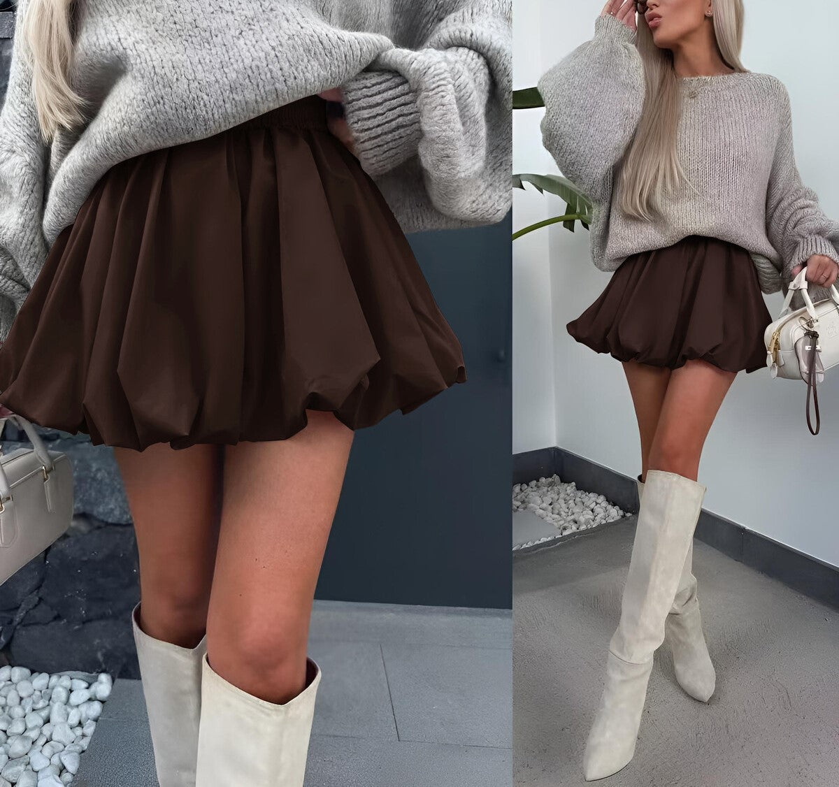 Dale un toque de estilo y volumen a tu outfit con nuestra falda Baloon color chocolate. Su diseño estructurado con efecto abullonado crea un look sofisticado y moderno, ideal para cualquier ocasión.