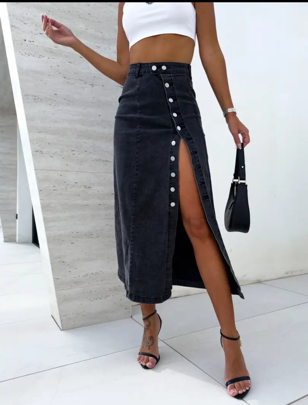Eleva tu estilo con esta falda midi de mezclilla negra, una prenda con personalidad y un toque atrevido. Diseñado con una cintura alta que resalta la figura, esta falda destaca por su fila de lateral de botones funcionales, que permiten ajustar la abertura según tu gusto, desde un look discreto a uno más audaz.