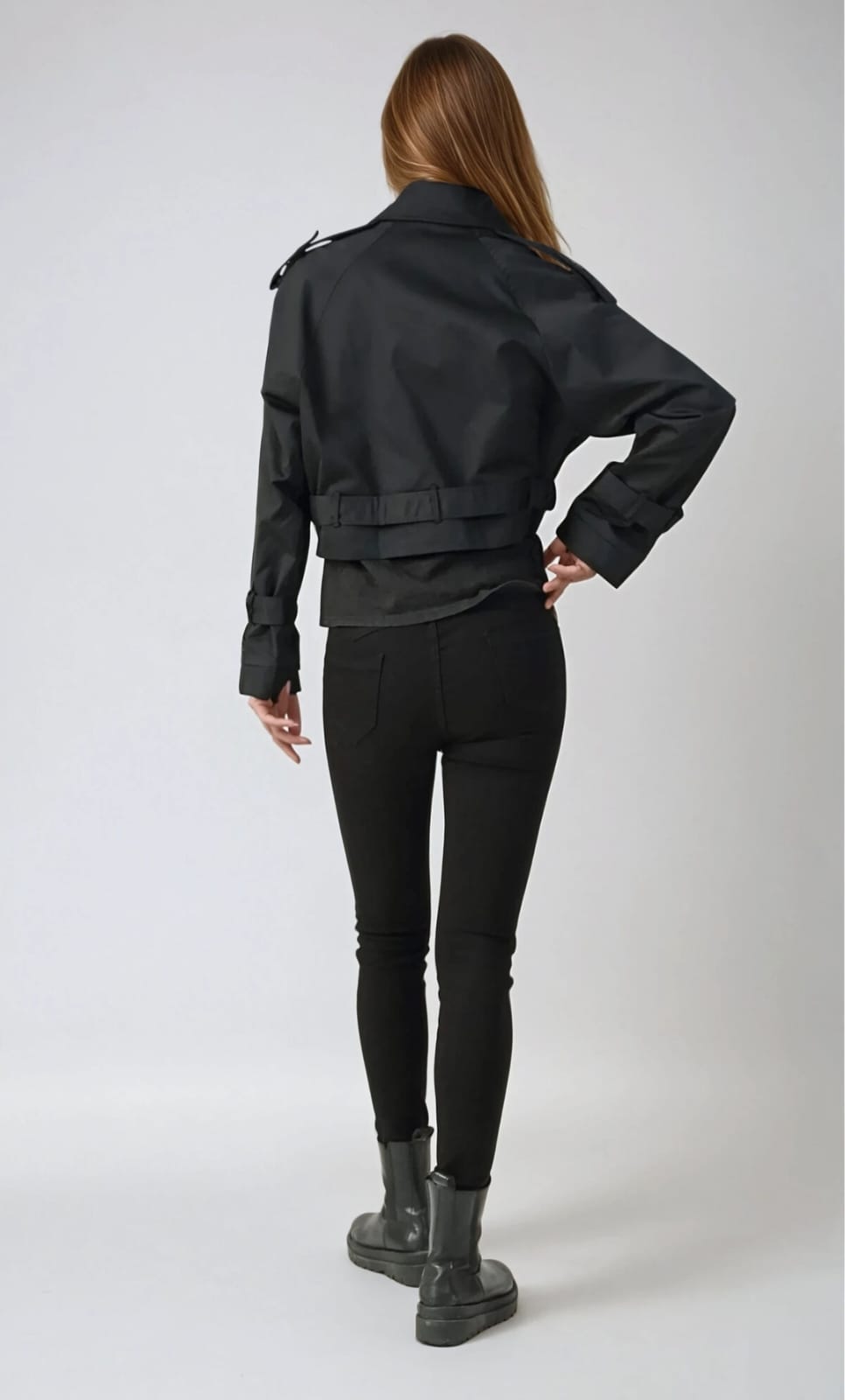 Nuestra gabardina corta combina el estilo clásico con un toque moderno y urbano. Diseñada con cuello de solapas de muesca y cierres cruzados con botones, aporta estructura y sofisticación a cualquier look.