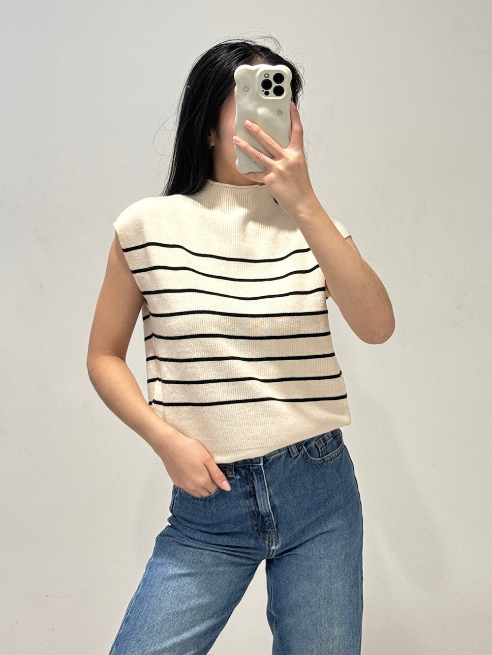Este jersey sin mangas es la pieza ideal para quienes buscan un look sofisticado y fresco. Con un diseño clásico de rayas sobre fondo beige, ofrece un toque minimalista y moderno. Su cuello semi-alto y tejido de punto suave garantiza comodidad y estilo en cada ocasión.