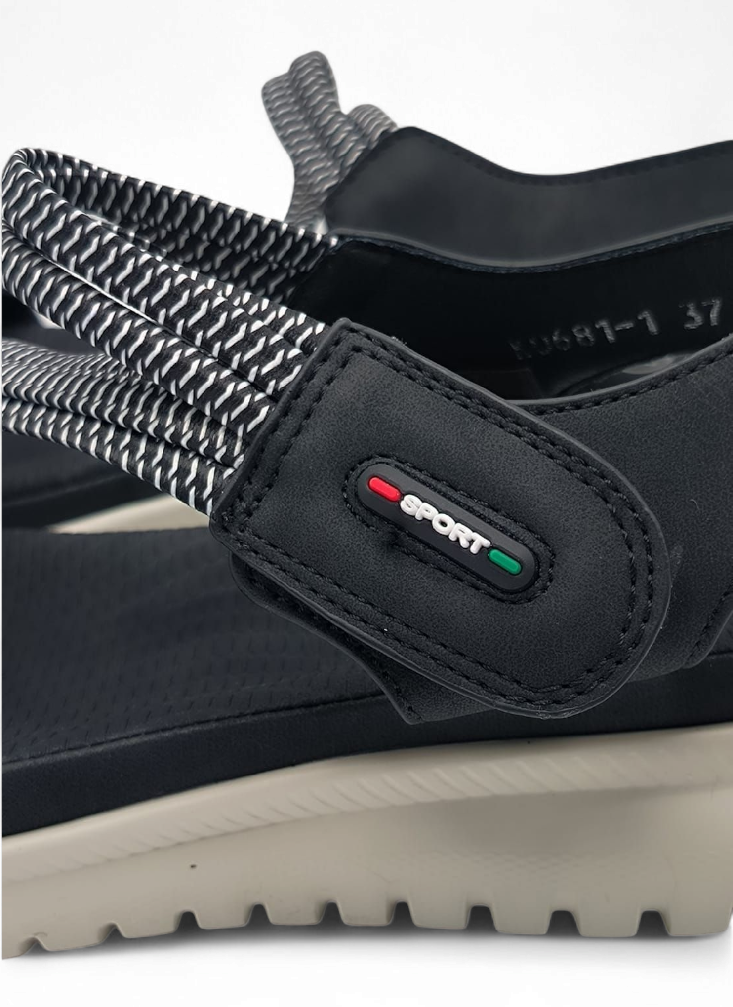 Sandalias deportivas en color negro con detalles tejidos en blanco, diseñadas para ofrecer comodidad y estabilidad en cada paso. Cuentan con cierre de velcro ajustable y tiras elásticas que se adaptan al pie. La suela de goma antideslizante en tono beige proporciona excelente agarre y amortiguación. Perfectas para caminatas, viajes o días activos sin renunciar al estilo.