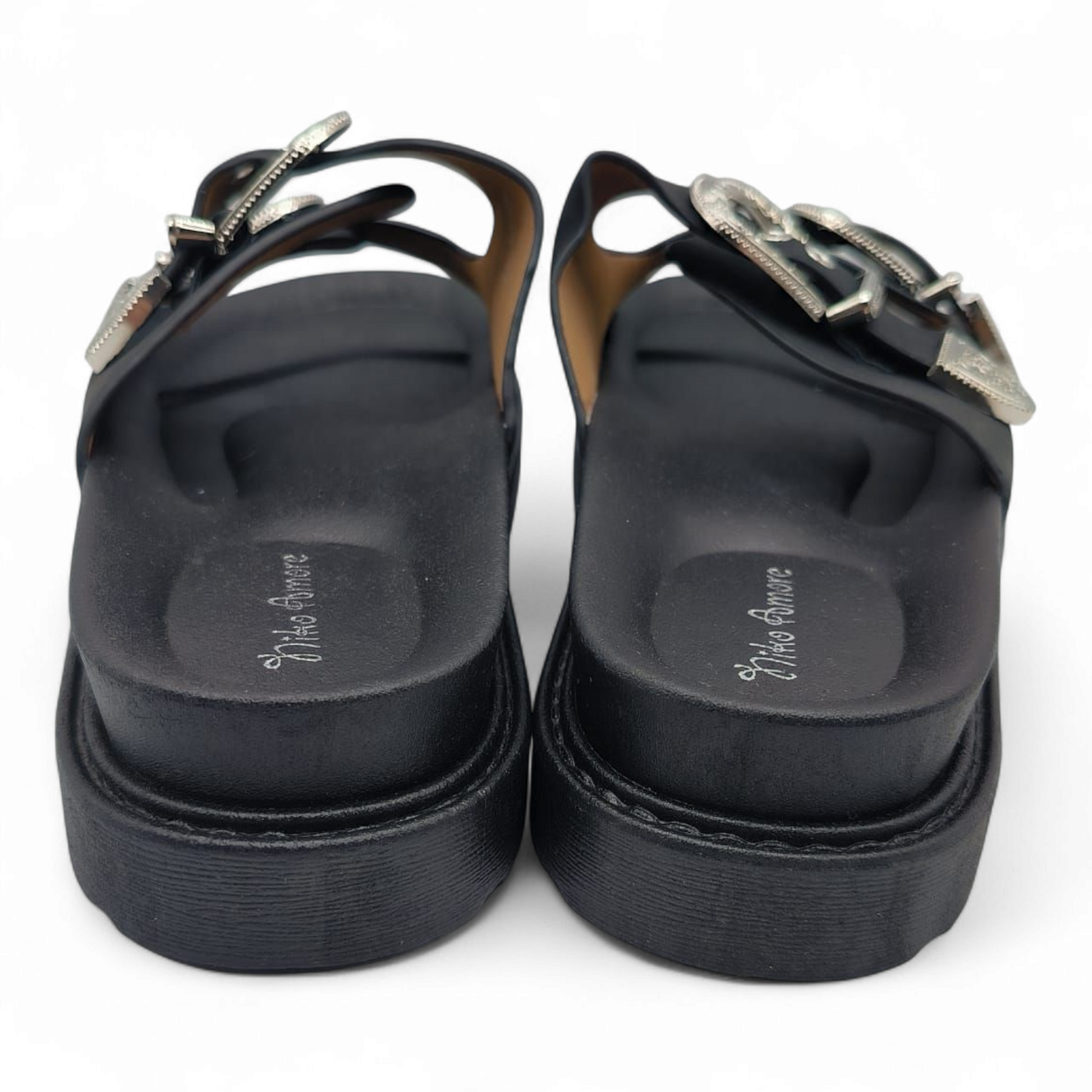 Sandalias negras con doble hebilla metálica estilo western, perfectas para un look casual con carácter. Con diseño ergonómico y plantilla acolchada, ofrecen comodidad y estilo en cada paso. Su suela plana con plataforma sutil aporta altura sin sacrificar confort. Ideales para combinarlas con jeans, vestidos o conjuntos relajados de verano. ¡Fáciles de llevar y difíciles de olvidar!