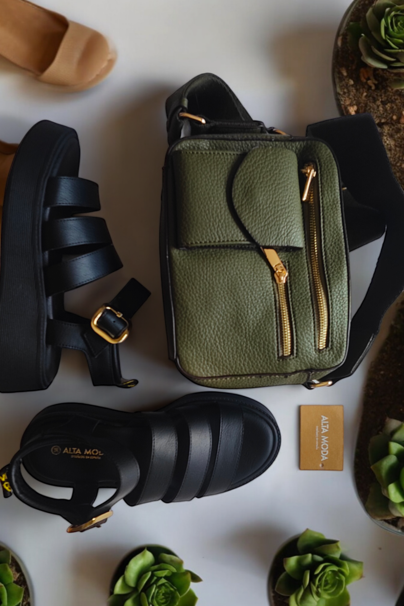 Un clásico con sello nacional. las sandalias Roma Black están hechas en España y combinan el estilo gladiador con una plataforma moderna y cómoda. Su diseño de tiras anchas y en acabado tipo piel y hebilla dorada las convierte en complemento perfecto para tus looks mas urbanos y con carácter. ¡Ideales para destacar con estilo y comodidad!