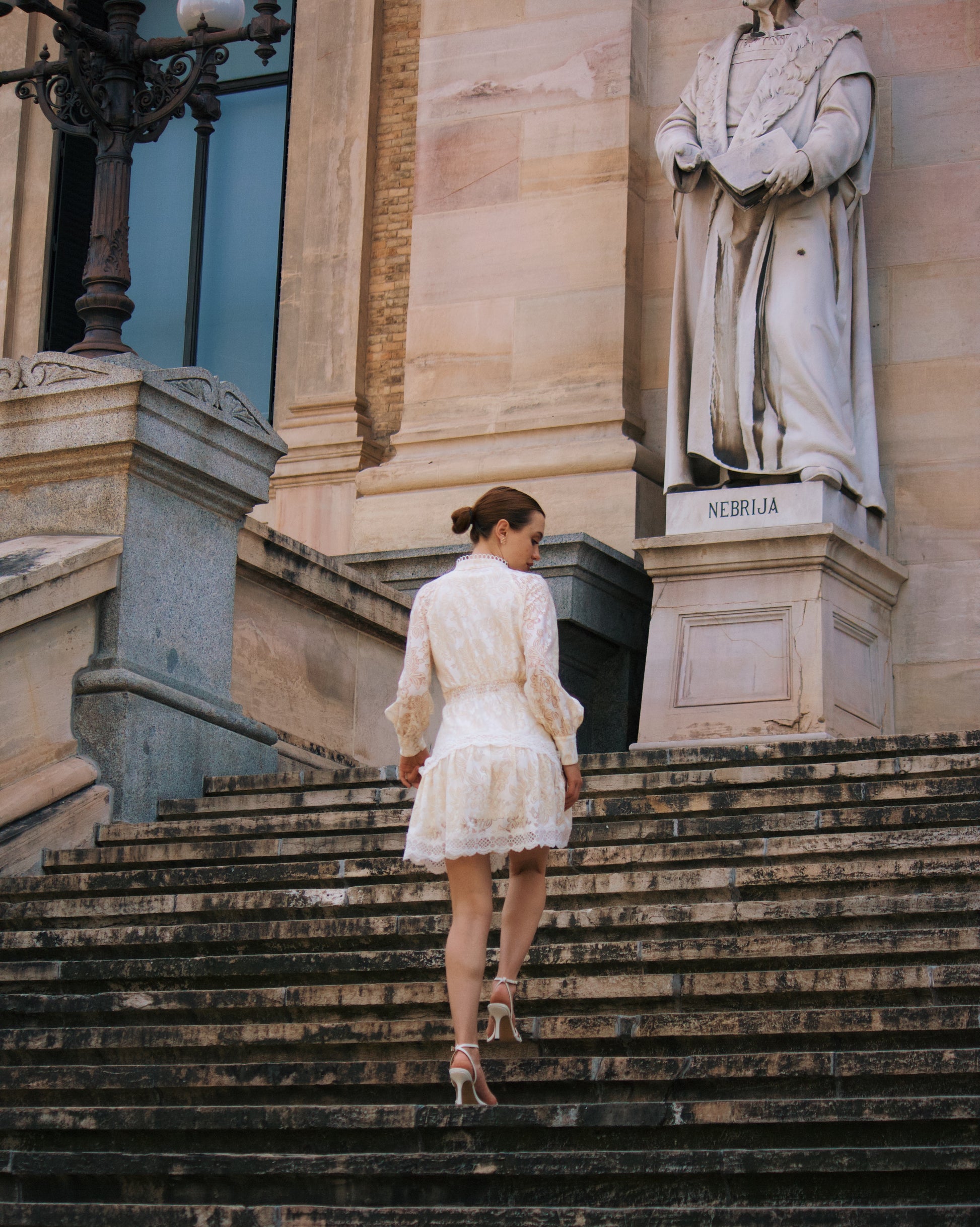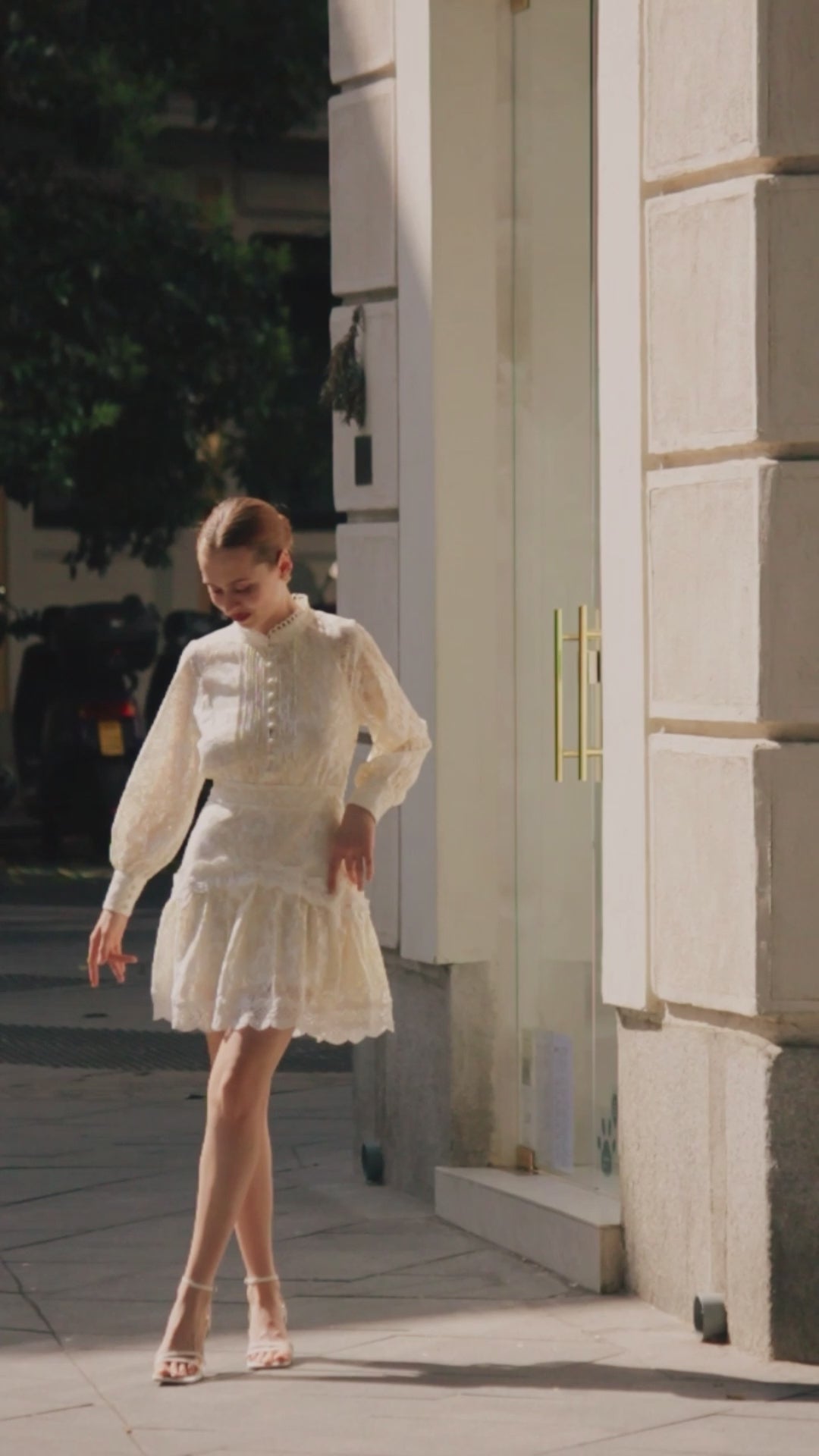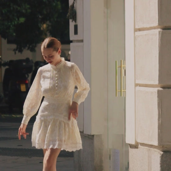 Vestido corto de encaje bicolor con delicados detalles florales. Presenta cuello ascendente, mangas largas abullonadas y un corte entallado que resalta la silueta. Ideal para ocasiones especiales o para destacar con un look femenino y elegante.