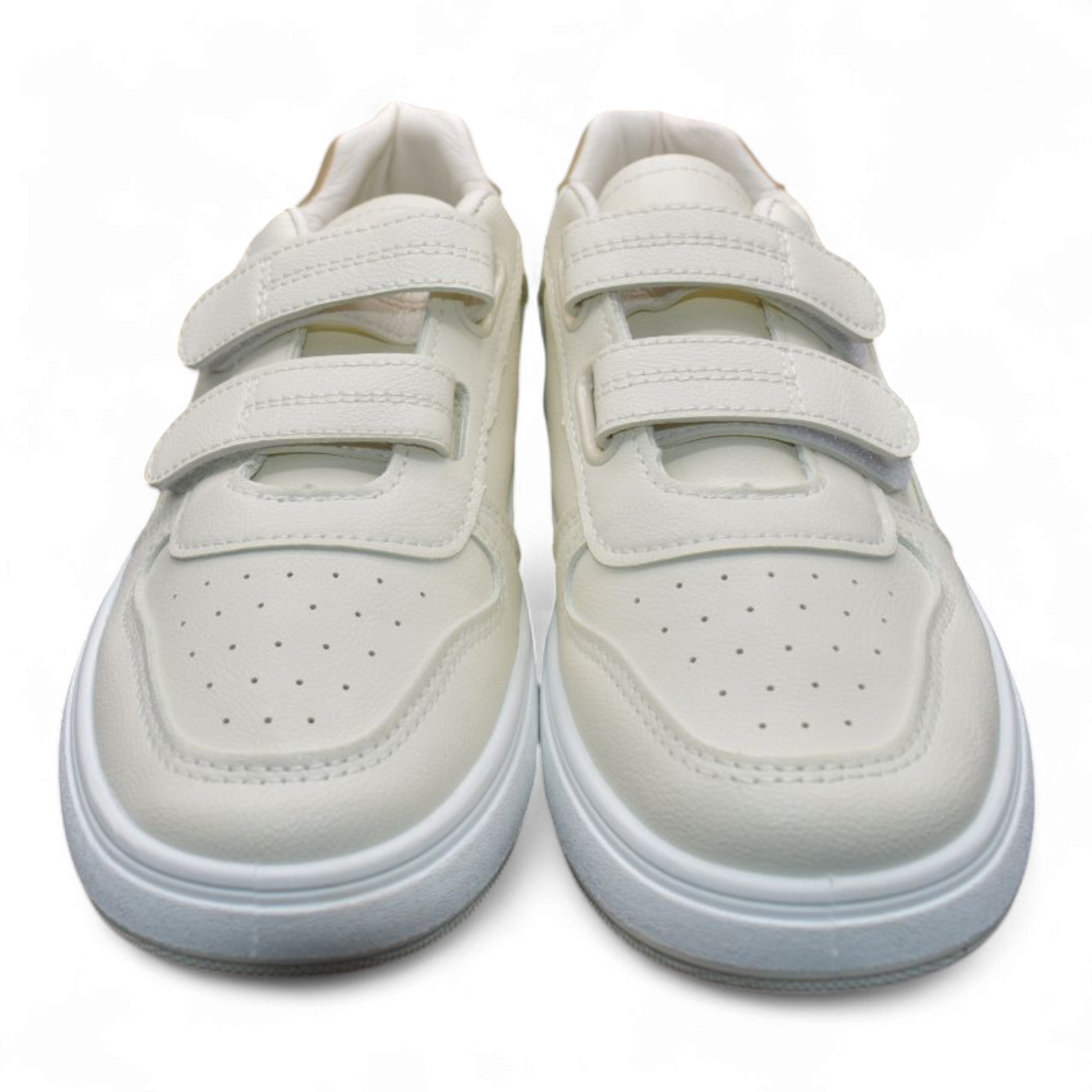 Zapatillas en tono blanco hueso con cierre de velcro doble, diseñadas para facilitar el calzado sin renunciar al estilo. Su diseño deportivo con detalle beige en el talón aporta un toque elegante y moderno. Confeccionadas en material suave y resistente, con suela antideslizante y acolchado interior para máxima comodidad. Perfectas para un look casual, urbano o relajado.